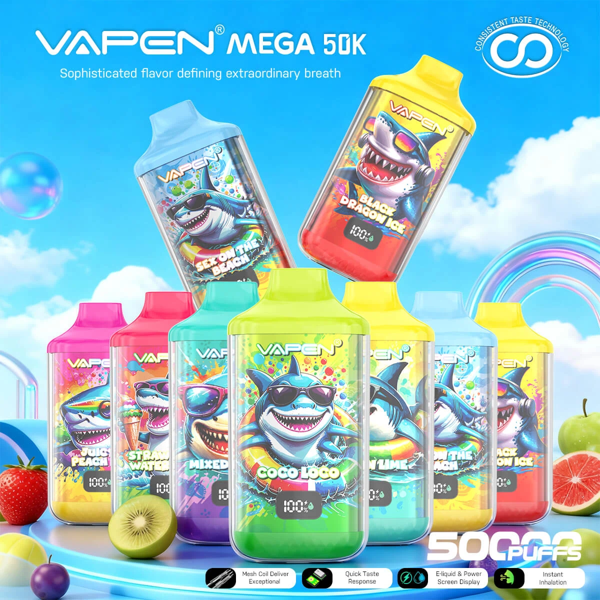VAPEN MEGA 50K is the latest high-performance disposable vape from VAPEN, designed to deliver massive endurance, bold flavor, and effortless convenience. With a colossal 50,000-puff capacity, a 650mAh rechargeable battery, and Type-C fast charging, the MEGA 50K sets a new benchmark for long-lasting vaping. Its crystal-clear shell, shark-pattern design, and advanced flavor technology (CTT) make it not just powerful — but iconic.